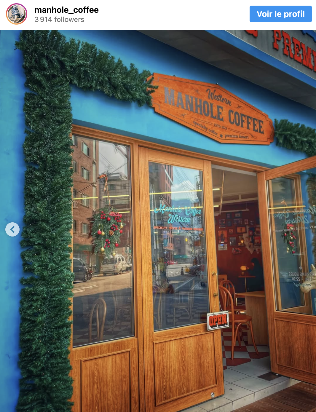 -Manhole Cafe :C’est un trésor caché réputé pour son ambiance d’inspiration britannique et ses produits haut de gamme. L’intérieur cosy respire le bois chaleureux, le mobilier ancien et des étagères de livres rappelant une bibliothèque britannique. En hiver, le lieu devient encore plus accueillant grâce à des décorations chaleureuses. Que vous cherchiez un endroit pour déguster un dessert raffiné ou simplement un café cocooning, Manhole Coffee est le cadre idéal pour une pause familiale toute douce. B1, B Block shopping center, 247 Yeongsin-ro, Yeongdeungpo-gu, Seoul 12h-21h30 Attention: fermé lundi et mardi