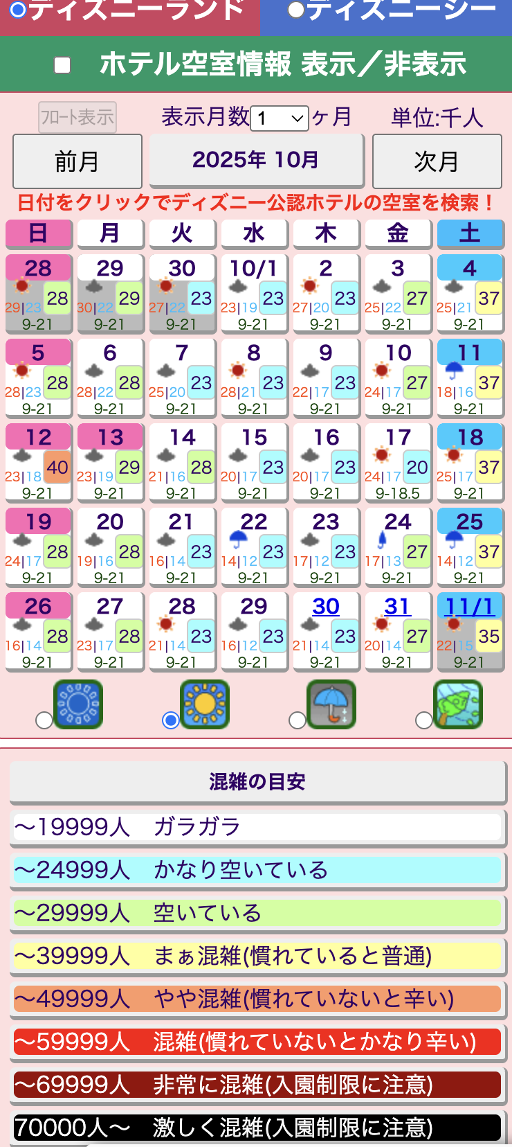 -Avant d’acheter vos billets: vérifier ce calendrier !!!! Il est très facile à comprendre (éviter de faire la traduction sinon on ne comprend plus rien car l’image est assez petite…) En haut au dessus des jour l’année et le mois. En rose on commence avec 日 DIMANCHE et on termine en bleu avec 土 SAMEDI Jour par jour une estimation du nombre de personnes qui viendront au parc en fonction des ventes de billets, du temps météo etc.. Il s’avère que les prédictions sont assez juste et je vous encourage à y regarder de plus près avant de décider à quelle date vous rendre au parc ! Plus vous allez ver le noir plus il y a de monde attendu ! Sélectionnez le bon parc : en rouge en haut à gauche DISNEYLAND et en bleu en haut à droite DISNEY SEA.